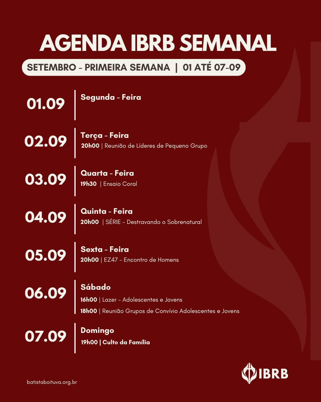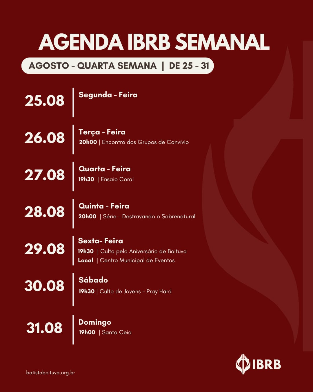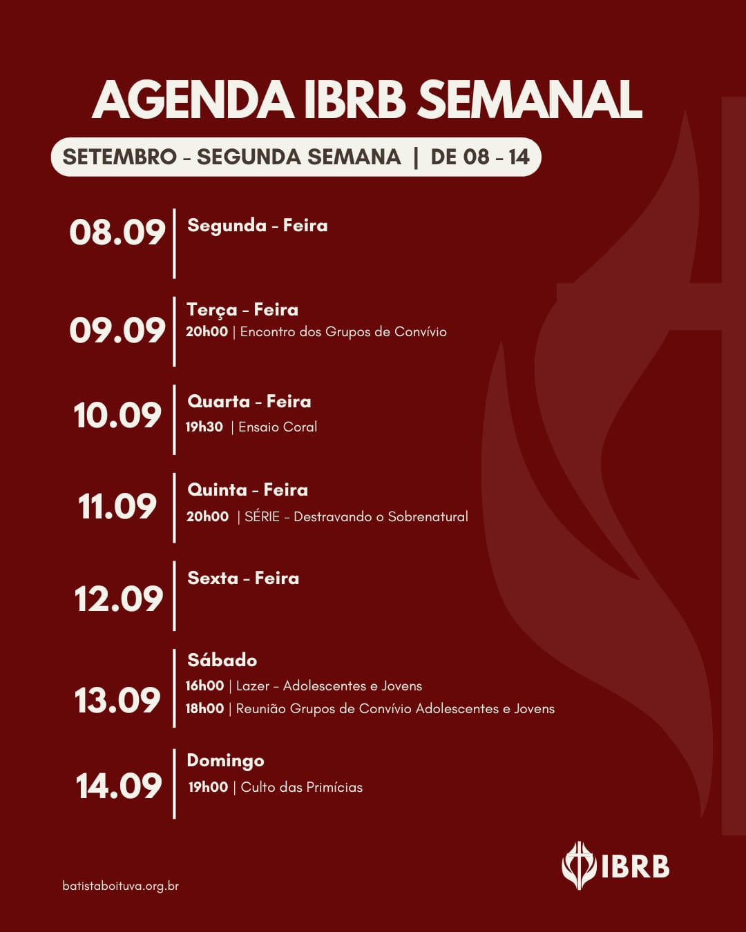 Confira a agenda desta semana da Igreja Batista Renovada de Boituva!