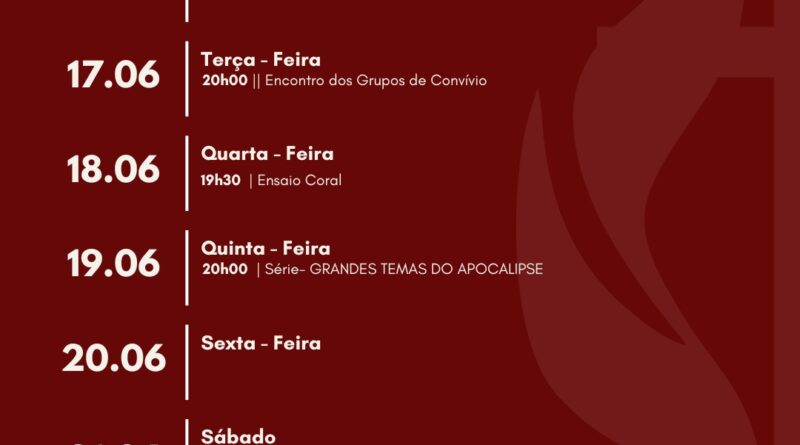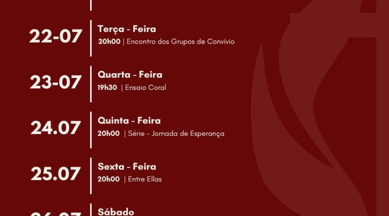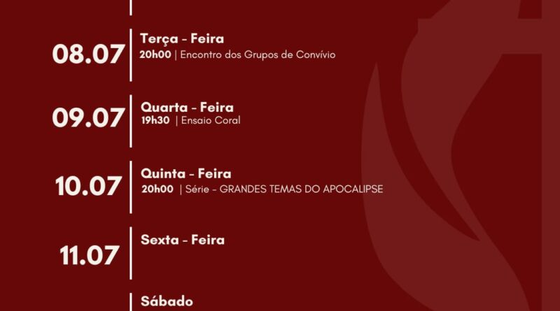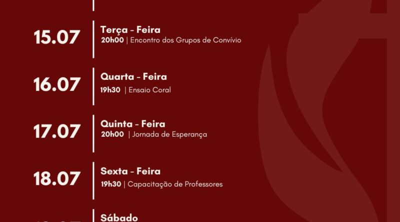 Agenda 7 de julho de 2025 Leandro Carvalho de Oliveira Agenda Semanal – de 7 a 13 de julho Confira a agenda desta semana da Igreja Batista Renovada de Boituva! Read More