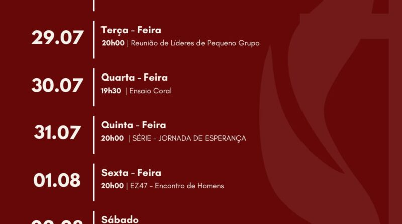 Agenda 21 de julho de 2025 Leandro Carvalho de Oliveira Agenda Semanal – de 21 a 27 de julho Confira a agenda desta semana da Igreja Batista Renovada de Boituva! Read More