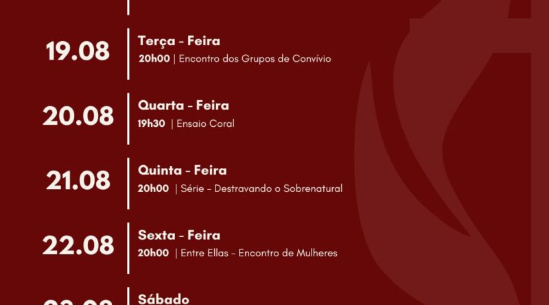 Agenda 18 de agosto de 2025 Leandro Carvalho de Oliveira Agenda Semanal – de 18 a 24 de agosto Confira a agenda desta semana da Igreja Batista Renovada de Boituva! Read More