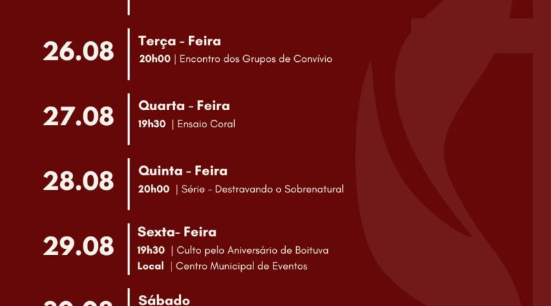 Agenda 25 de agosto de 2025 Leandro Carvalho de Oliveira Agenda Semanal – de 25 a 31 de agosto Confira a agenda desta semana da Igreja Batista Renovada de Boituva! Read More