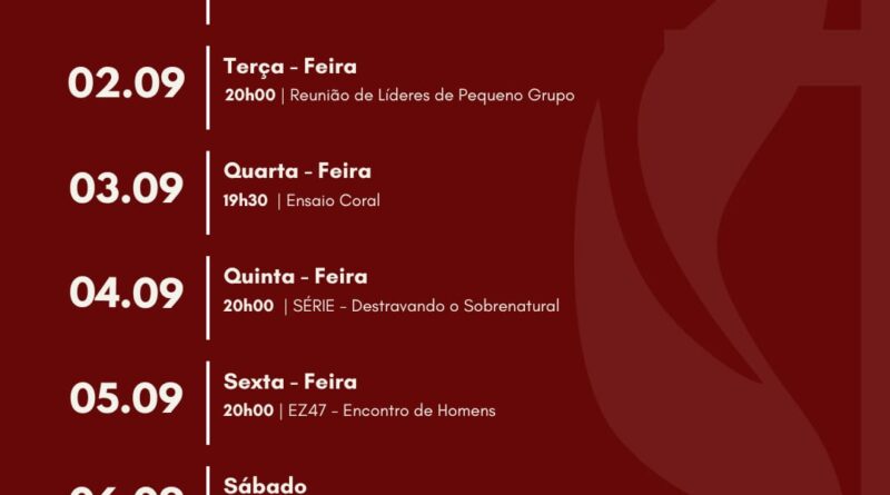 Agenda 1 de setembro de 2025 Leandro Carvalho de Oliveira Agenda Semanal – de 1 a 7 de setembro Confira a agenda desta semana da Igreja Batista Renovada de Boituva! Read More