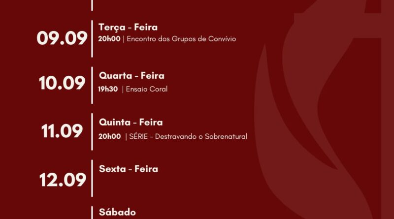 Agenda 9 de setembro de 2025 Leandro Carvalho de Oliveira Agenda Semanal – de 8 a 14 de setembro Confira a agenda desta semana da Igreja Batista Renovada de Boituva! Read More